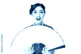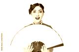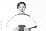 Beautiful asian woman holding big fan. Attractive beautiful young woman gets exciting or surprising of some sales, discount of goods, brand, product. Use for advertising. Isolated on white, copy space