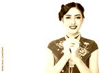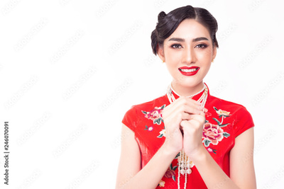 Attractive beautiful Chinese woman blessing customer to get wealthy, happiness, good health, best luck for the year. Charming girl wishing you happy Chinese New Year. isolated on white, copy space