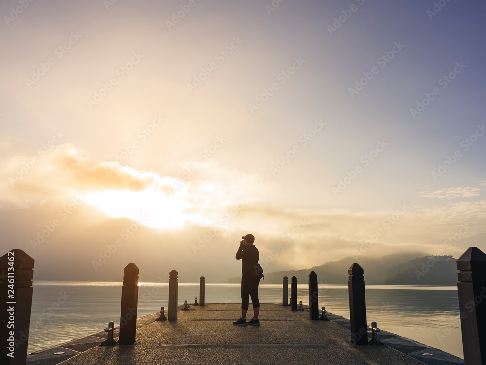 Traveler take picture on pier Lake outdoor sunrise Nature explorer