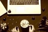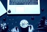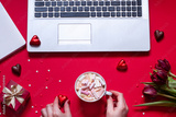 Valentine day concept flat lay with a laptop on the red background. Top view holiday card.