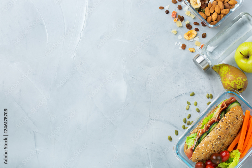 Lunch box with sandwich, fruits, vegetables, nut mix and water