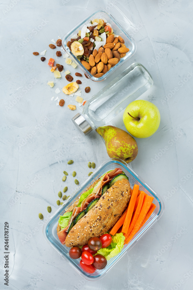 Lunch box with sandwich, fruits, vegetables, nut mix and water
