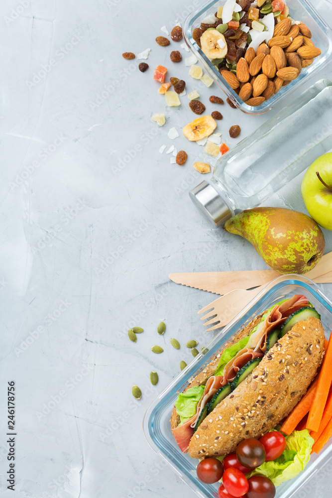 Lunch box with sandwich, fruits, vegetables, nut mix and water