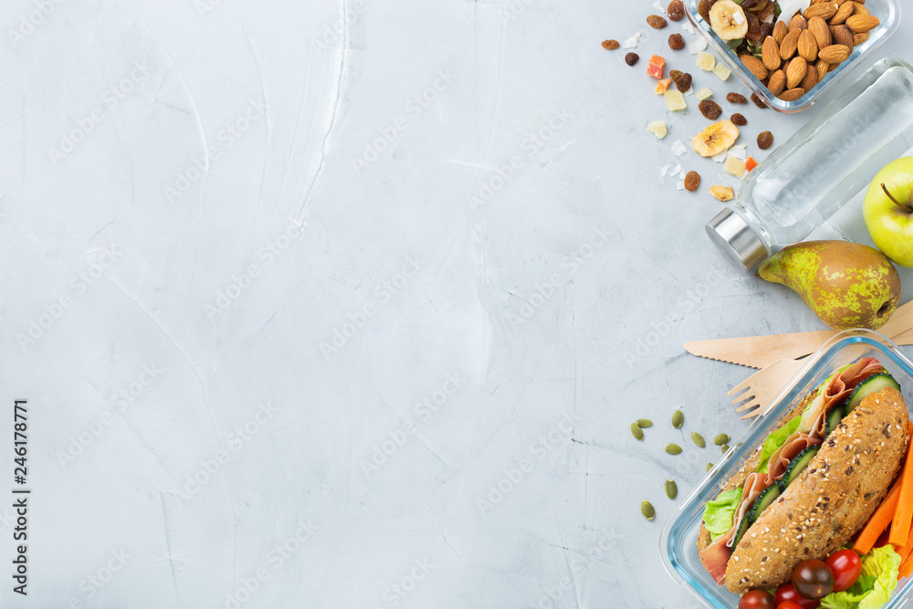 Lunch box with sandwich, fruits, vegetables, nut mix and water