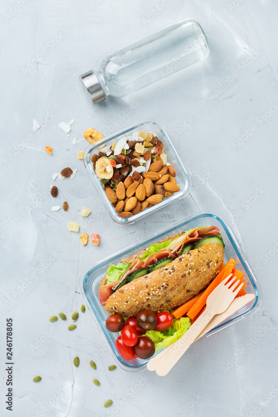 Lunch box with sandwich, fruits, vegetables, nut mix and water