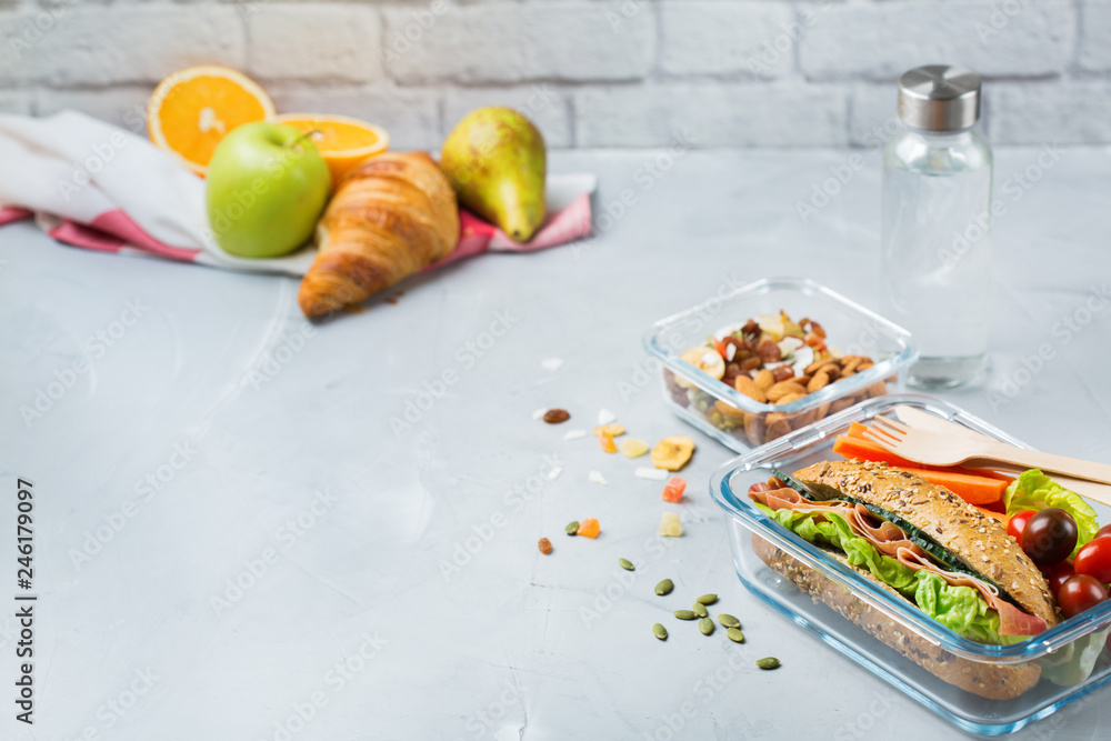 Lunch box with sandwich, fruits, vegetables, nut mix and water