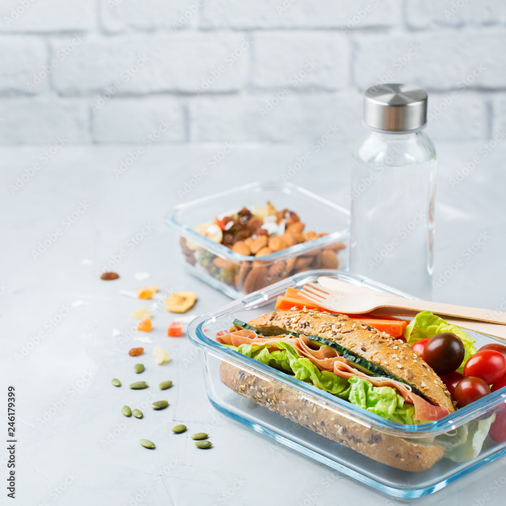 Lunch box with sandwich, fruits, vegetables, nut mix and water
