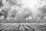 wooden table and spring grass and tree leaves background