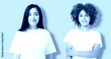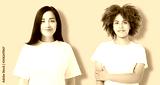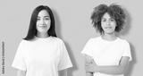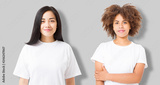 Asian and african american girl in blank template t shirt isolated on gray background. Women in tshirt with copy space and mock up for advertising. White shirts. Front view