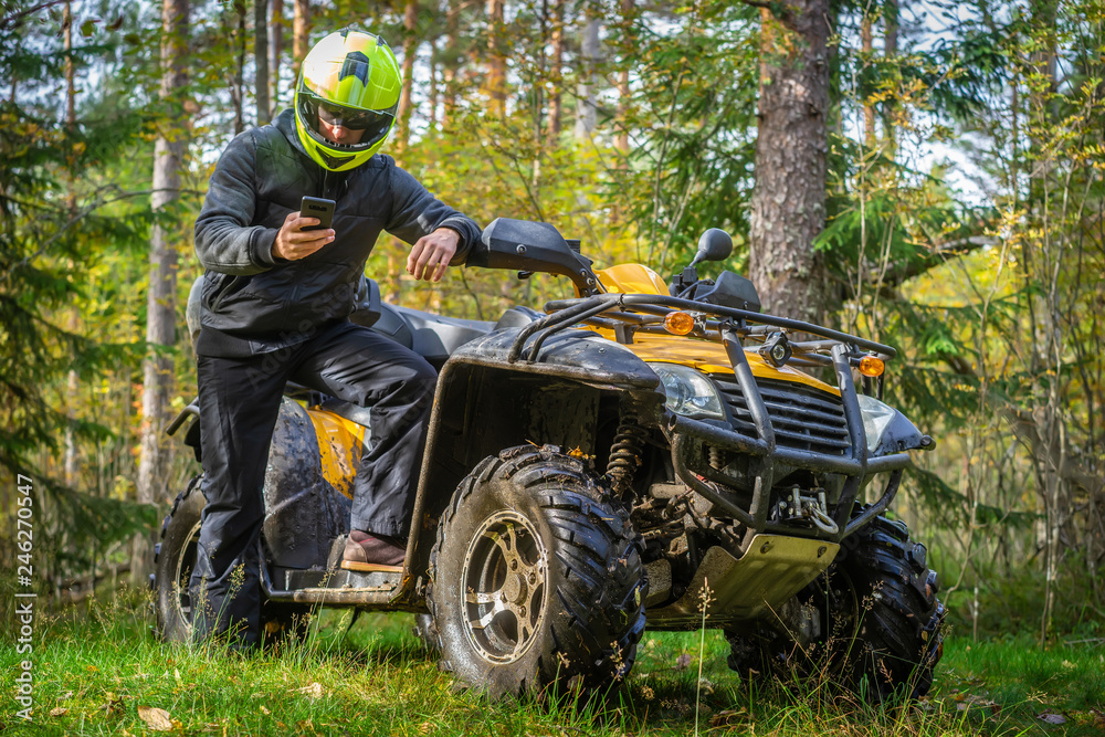 A man travels on ATV. Yellow quad bike. Off-road travel. A man studies the map of the area by phone. Yellow ATV.
