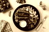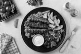 Traditional cevapcici served with baked potatoes. Flat lay. Stone background.