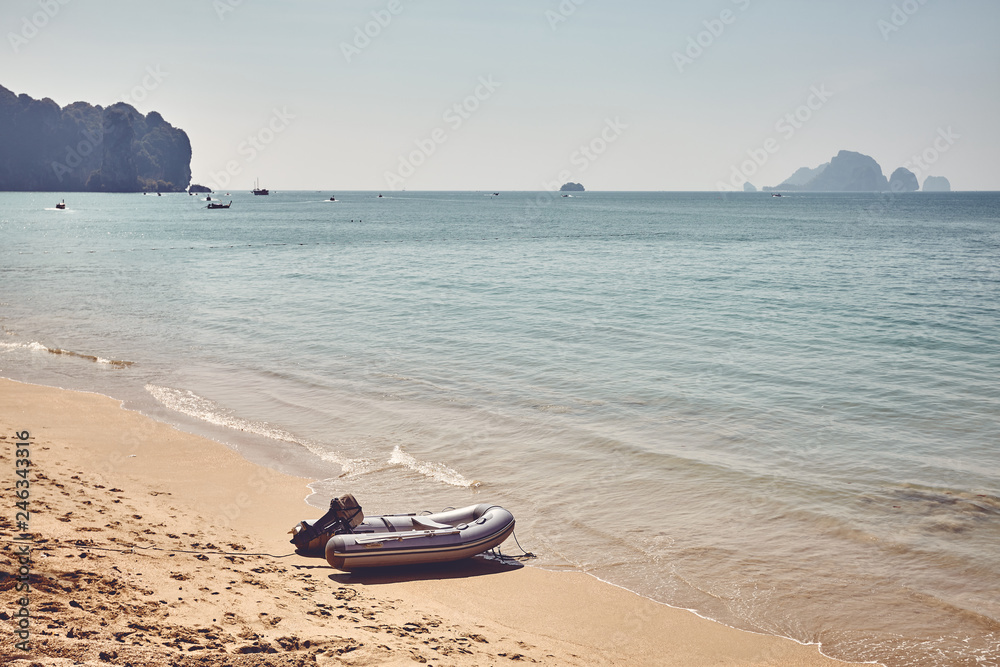 Pontoon on an empty beach, color stylized travel concept picture, selective focus, Thailand.