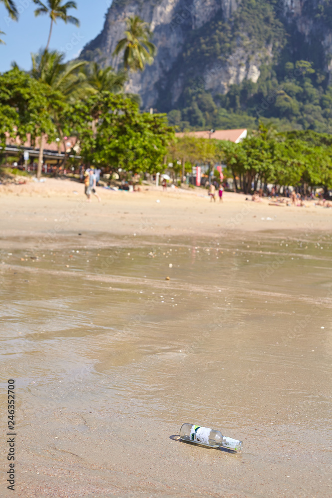 Empty glass bottle left on a beach, tourism development related environment littering concept, Thailand.