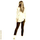 Woman in jeans and blue shirt goes on white background isolation, top view