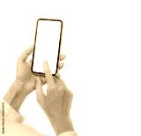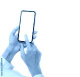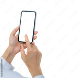 Woman's hand holding and using smartphone. Closeup hand touching smartphone with blank screen isolated on white background and copy space for text. Mobile phone with blank screen. Online marketing.