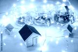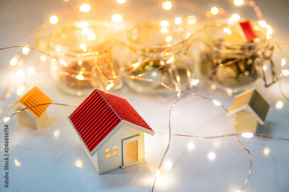 House models and coins in currency glass jar with decorative Christmas lights on glossy table. Saving money for retirement. Business and finance marketing growth during festive holiday season.