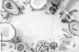 Healthy vegan fat food sources, omega3, omega6 ingredients - almond, pecan, hazelnuts, walnuts, olive oil, chia seeds, avocado, coconut, banner copy space
