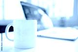 cup of coffee and laptop on the table. Coffee mug and notebook on the table in office working interior.