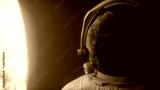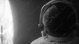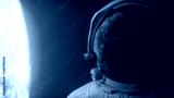 A lone astronaut looks at the planet earth in orbit in outer space, the planet earth reflects in a spacesuit helmet. Cinematic 3d illustration for scientific programs on space, planet earth and others