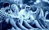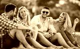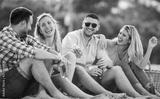 Group of friends enjoying picnic on the beach. Lifestyle, vacation, relationships concept
