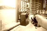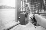 Signal of remote control when person open automatic gate at house with sunlight ray