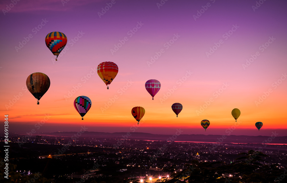 The Colorful hot air Balloons flying above city on sunset time before dark coming with colorful of light and a beautiful twilight and sunset sky background.