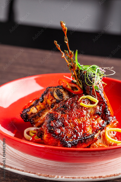 American cuisine concept. BBQ pork ribs baked in honey mustard. Serving dishes in a restaurant in ceramic ware. On the table a glass of red wine. copy space