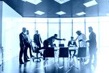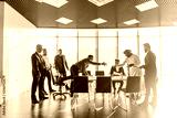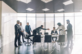 Ironic shot of caucasian businessman climbs over the office desk on his knees to reach out for a hand shake with his Arabian opponent. Reconciliation, concord and agreement concept.