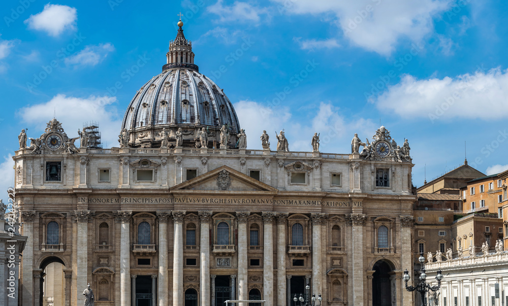 panoramic front view on Dome of St. Peter's Basilica with statues of apostles chapel with bell and old clock in Vatican City, Italy