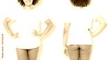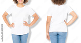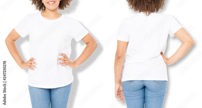 African american girl in white t shirt template and shadow on isolated wall background. Blank t shirt design. Front and back view. Mock up and copy space. Cropped image