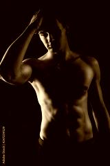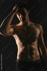 Portrait of a man with a beautiful athletic body in a low key. Pumped up guy with a naked torso.