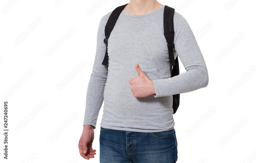 Front view. Young man wearing blank long sleeve t-shirt and backpack isolated on white background. Copy space. Place for advertisement. Student education concept.