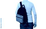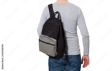Back view. Young man wearing blank long sleeve t-shirt and backpack isolated on white background. Copy space. Place for advertisement. Student education concept.