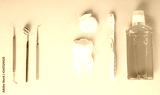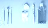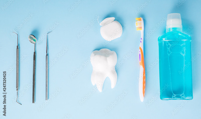 Dental health and teethcare concept. Professional steel dental instruments with a mirror near white tooth model, toothbrush, dental floss and mouthwash on light blue background.