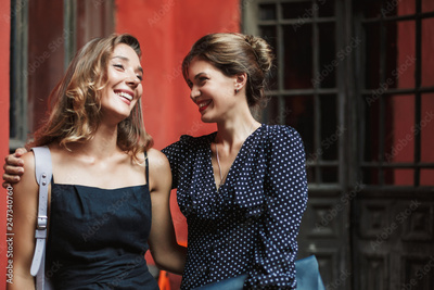 Two young beautiful smiling women in black dresses hugging each other joyfully while spending time together in old courtyard