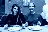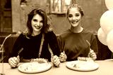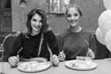 Young beautiful woman in red and pretty smiling woman in black sitting at the table with food and balloons near happily looking in camera together while spending time in old cozy courtyard of cafe