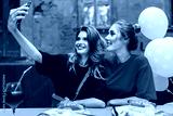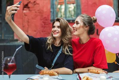 Young nice woman in red and pretty smiling woman in black sitting at the table with food and balloons near happily taking photos on cellphone together in old cozy courtyard of cafe