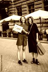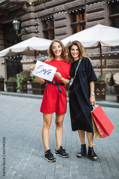 Young smiling woman in red dress holding white paper with sale while pretty lady in black near holding colorful shopping bags in hand happily looking in camera together on street
