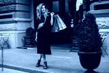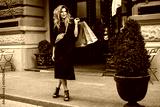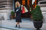 Young beautiful woman in black dress with cross bag dreamily looking aside holding colorful shopping bags in hand while spending time on cozy city street alone