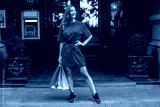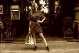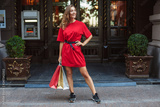 Young pretty smiling woman in red dress happily looking aside while holding colorful shopping bags in hand with big door on background outdoor
