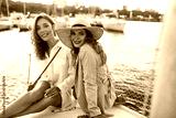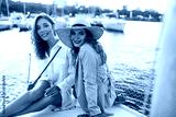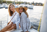 Young beautiful woman in white shirt and pretty lady in stripped jacket and straw hat dreamily looking in camera spending time on yacht with beautiful harbor view on background