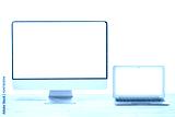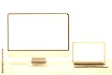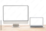 Conceptual workspace or business concept. Laptop computer and big computer monitor display with blank white screens on light wooden table. Isolated background. IT mockup.