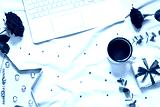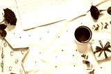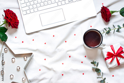 Valentine day concept frame on the white blanket with a keyboard . Holiday top view card with red roses. Copy space