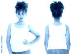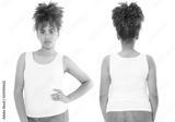 Shirts set. Summer t shirt design and close up of young afro american woman in blank template white t-shirt. Mock up. Copy space. Curly hair. front and back view.