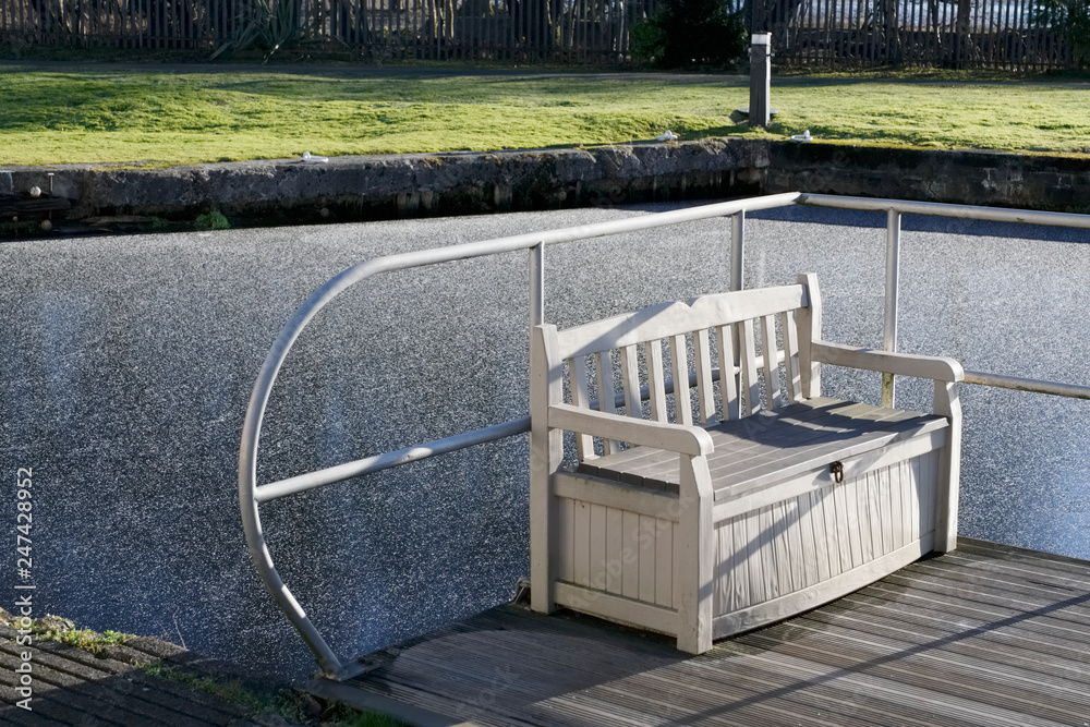 Outdoor summer seat in sunshine at river canal water under sunlight