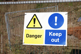 Danger keep out safety sign on fence at construction building site
