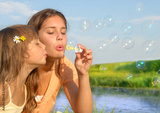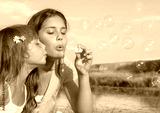Siblings blowing soap bubbles