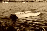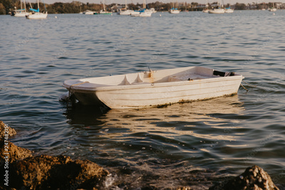 Lonely Isolated Rowboat On Peaceful Calm Water Ocean Bay