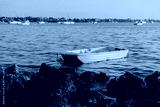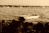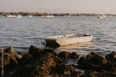 Lonely Isolated Rowboat On Peaceful Calm Water Ocean Bay