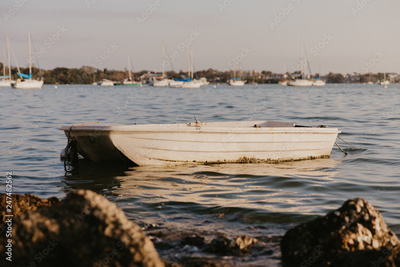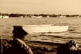 Lonely Isolated Rowboat On Peaceful Calm Water Ocean Bay